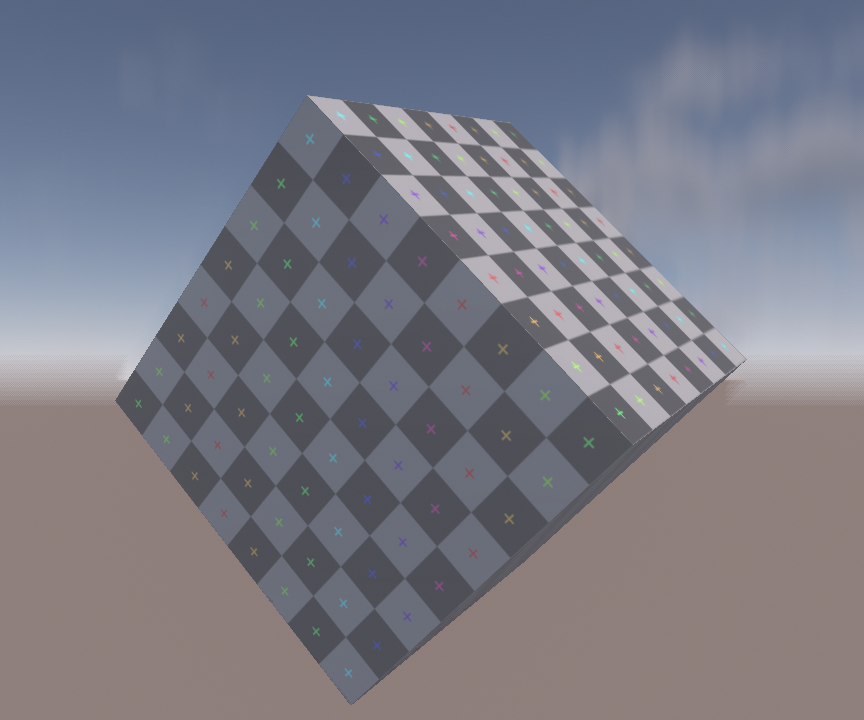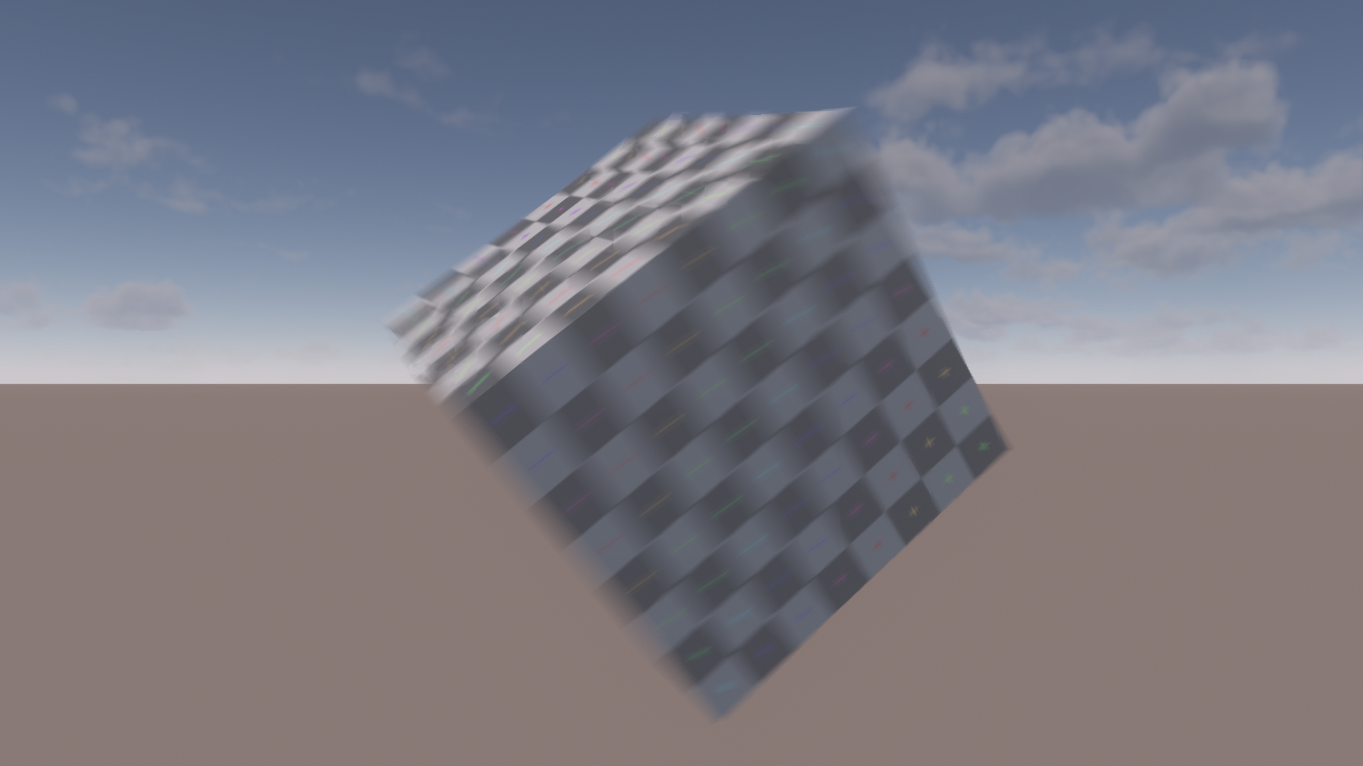 Using a single blur direction suffers from artifacts in scenarios like rotation and separate background/foreground motion. Let’s demonstrate this with a simple test scene. Here, the cube is blurred horizontally and the background is blurred vertically. In this case, the sharp change in blur direction is very obvious and causes distracting edges in the blur. Dithering the direction between neighboring motion tiles can hide small differences but does very little to help with an extreme case like this.